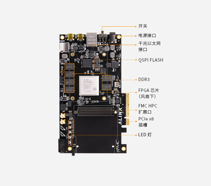 PCIe x8 接槽,FMC HPC 扩展,千兆以太网等丰富接口