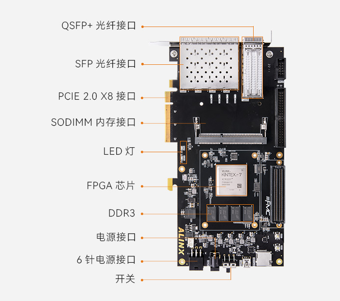 1 个 PCIe x8 接口、4 路 10G SFP 光纤接口、1 路 40G 的 QSPF+ 光纤接口、1 路 UART 串口接口、1 路 SD 卡接口、1 个 FMC 扩展接口、1 个 40 针的扩展口等。