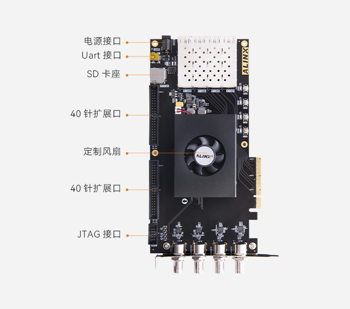 采用核心板加扩展板的模式,方便用户对核心板的二次开发利用。 丰富的外围接口:1 个 PCIe x8 接口、4 路光纤接口、2 路 SDI 输出接口、2 路 SDI 输入接口、1 路 UART 串口接口、1 路 SD 卡接口、 2 个 40 针扩展接口等。满足用户各种高速数据交换,数据存储, 视频传输处理以及工业控制的要求。为高速数据传输和交换,数据 处理的前期验证和后期应用提供了可能 。
