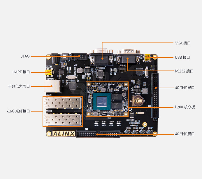 40 针扩展口 | 2 个 40 针 2.54mm 间距的扩展口,可以外接 ALINX 各种模块 (双目摄像头,TFT LCD 屏,高速 AD 模块等) |