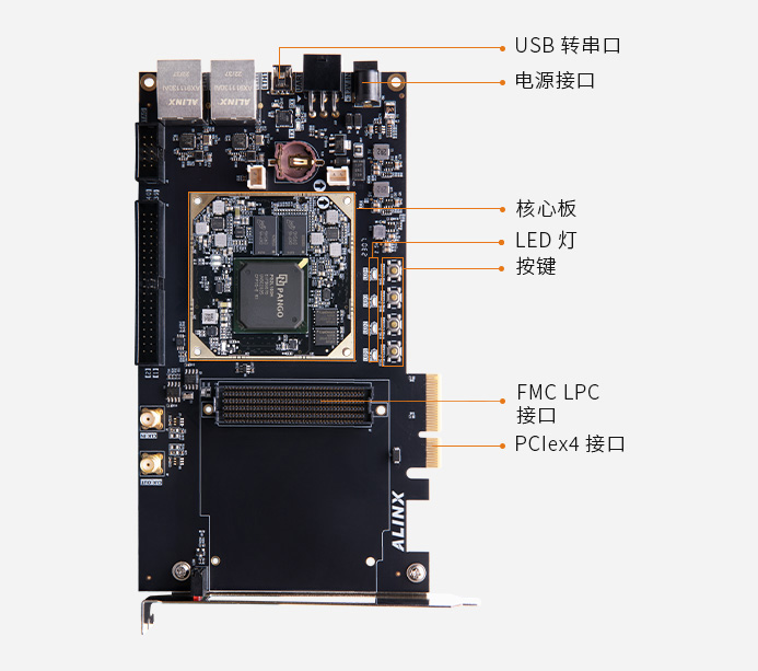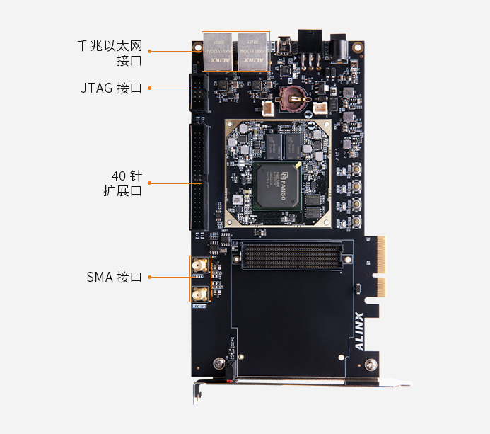 PCIe2.0 x4 接口、FMC 接口、千兆以太网接口、40 针的扩展口满足 PCIe 高速数据传输,视频图像处理和工业控制的要求