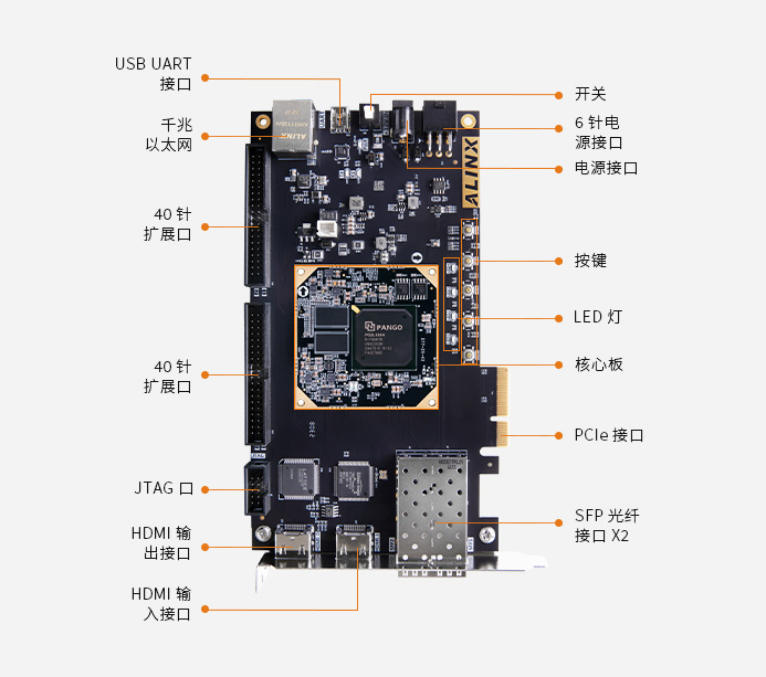 HDMI 输入输出接口、光纤通信接口、千兆以太网、UART 接口、40-PIN 扩展口、JTAG 调试 满足视频图像处理和工业控制等方面要求