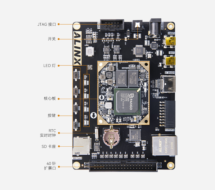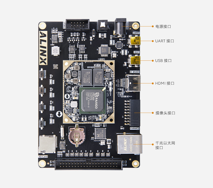 HDMI 输出接口、USB、以太网、摄像头接口、JTAG 调试接口 、1 路 40PIN 扩展口、RTC 时钟等 满足视频图像处理和工业控制等方面要求。